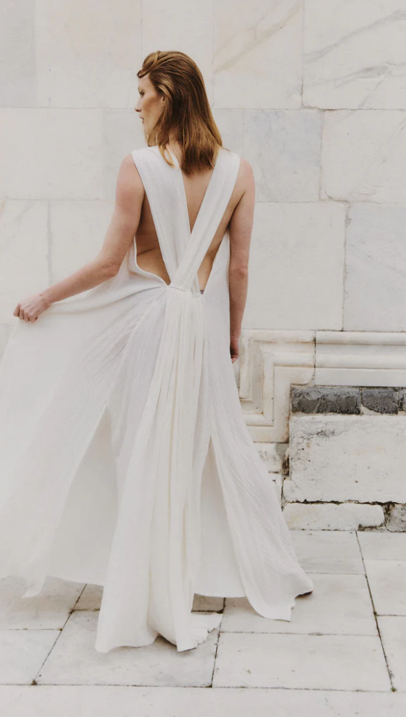 Our Sweet Surrender dress is crafted from free flowing swathes of organic cotton. A deep plunging neck and low crossed back creating an elegant flattering silhouette. Internal hidden tie can tighten the back across your body to your style and shape.