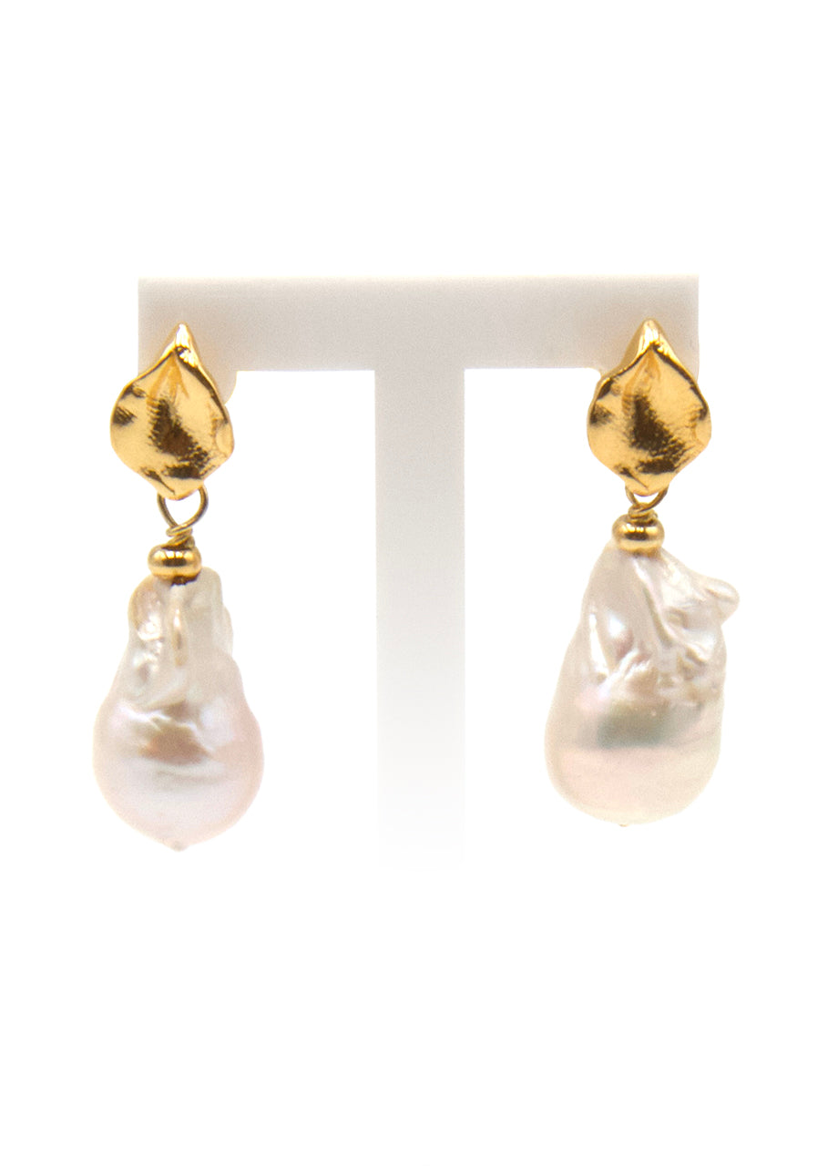 Large baroque freshwater pearl drop earrings with gold plated leaf stud top.