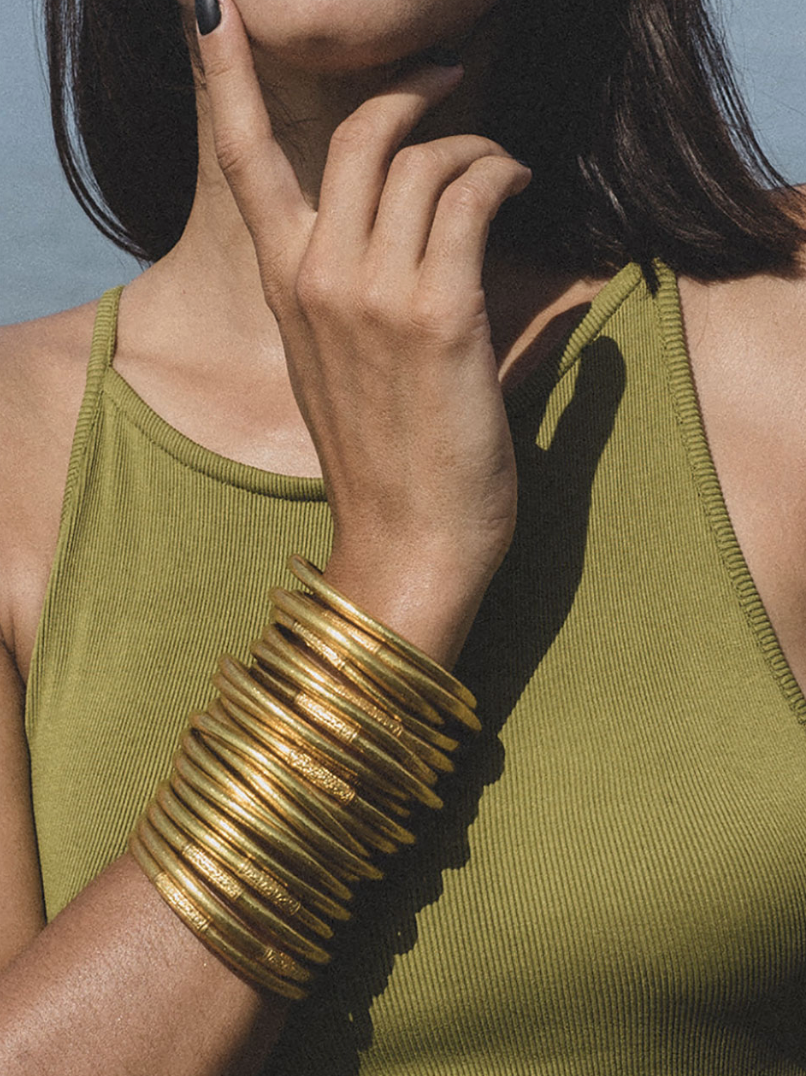 The Mantra bracelets are made using gold leaves. They are blessed and engraved with a luck and love mantra as part of the bangle.